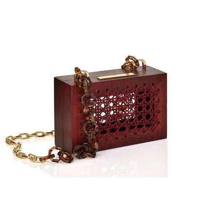 Rose is a modern shoulder bag with an acrylic and metallic chain, it has a rectangular shape. Inspired by the traditional rocking chairs. Wood is carved, hand painted or tinged in color, strands are hand-woven matching colors with the wood. Our bag is very feminine yet has a strong structured design.